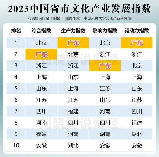 上图是中国人民大学文化产业研究院日前发布的“2023年中国省市文化产业发展指数”。在“生产力指数”、“驱动力指数”项目上,广东都是名列第一,但在“综合指数”方面落后于北京,在“影响力指数”上落后于北京和浙江。