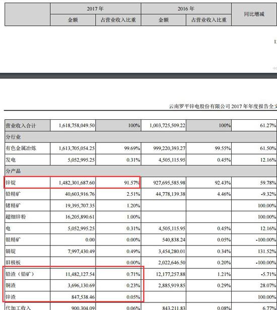 2017年度报告显示,公司锌锭产品是公司的主力营收产品,当期实现营业收入14.82亿元,占公司总营收的91.57%。此外,公司的铅渣(铅矿)、铜渣、锌渣仍在产生收入,尽管营收占比很低。