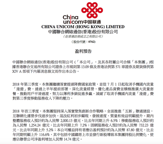 公告表示,中国联通发生税前非经常性损失预计约29.22亿元人民币。扣除该项非经常性损益事项后,联通在2018年度首三季度利润总额预计约134.68亿元人民币,同比增长约106.8%,归属于上市公司股东的净利润预计约44.64亿元人民币,同比增长约179.9%。