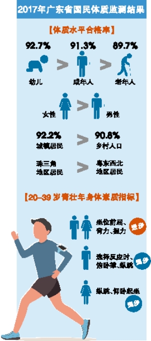 广东省国民体质监测中心研究员周卫海博士表示,从近几年的监测结果看,全省居民体质合格率呈逐年上升趋势,从2013年至2017年,5年间广东省居民体质合格率上升了1.5个百分点,其中幼儿和老年人体质水平提高较为明显,而成年人上升幅度较小。