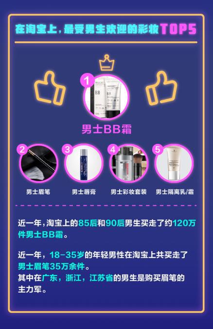 作为国民潮流风向标的淘宝可以很好的映证这一趋势。左手面膜,右手眉笔,一大波化妆品正被广大男士喜提。淘宝数据显示,近一年,淘宝上的85后和90后男生买走了约120万件男士BB霜。男士眉笔的受欢迎程度紧随其后,35万余件男士眉笔被18-35岁的年轻男性收入囊中。其中在广东,浙江,江苏省的男生是购买眉笔的主力军。男士BB霜,眉笔,唇膏,彩妆套装,隔离霜也成为了淘宝上最受男生欢迎的彩妆Top5。