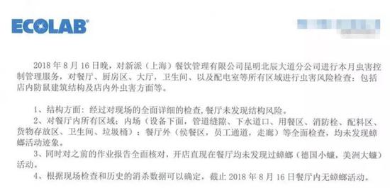 她介绍,李女士反映有异物后,门店立即组织通过店内视频等方式进行了相关排查,并即刻联系了第三方权威公司进行虫害消杀和检查,均未发现蟑螂和其他虫害痕迹(有相关报告)。