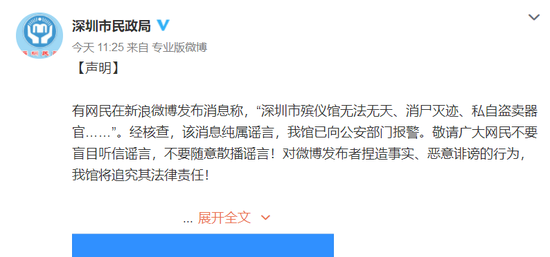 新京报快讯 据深圳市民政局官方微博消息,有网民在新浪微博发布消息称,“深圳市殡仪馆无法无天、消尸灭迹、私自盗卖器官……”。经核查,该消息纯属谣言,我馆已向公安部门报警。敬请广大网民不要盲目听信谣言,不要随意散播谣言!对微博发布者捏造事实、恶意诽谤的行为,我馆将追究其法律责任!
