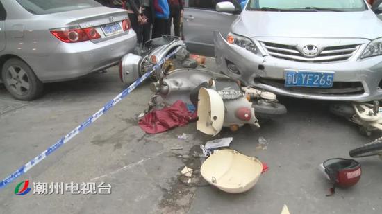 昨天上午七点半左右,潮州市区凤园路上埔市场路段发生惊险一幕。一辆小轿车突然失控径直撞向人群。