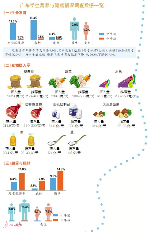 最新的第五次广东居民营养与健康状况调查结果显示,广东儿童青少年营养不良相关疾病明显减少,但饮食结构尚不合理,营养过剩、超重肥胖问题突出;与此同时,青少年消瘦率却也达到8%。