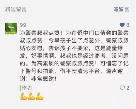 7日上午,清城区华侨中学考点一名考生忘记带药,正在执勤的黄警官得知后,将手机借给该考生联系家长。在校门口等待家长的过程中,黄警官风趣地鼓励该考生,“这是能量爆发,没问题的”,通过和考生聊天的方式缓解其紧张情绪。家长备受感动,特意来@平安清远 微信后台留言感谢,为暖心民警点赞!
