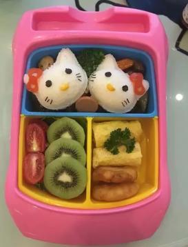 这款hello kitty套餐甚至是连大人看过之后都有种很想回到童年的冲动。而且,这一份小小的便当不仅满足了美感上的需要,营养搭配也是很丰富,有鸡蛋,肉饼,还有富含维C的猕猴桃和圣女果。