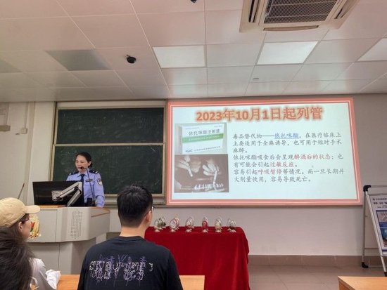 在禁毒课堂中,同和强戒所的警官在讲台上利用PPT结合仿真毒品及禁毒展板,根据学生的年龄和心理特征,通过实际案例与禁毒视频相结合的形式,以通俗易懂的语言为在场学生全面科普毒品预防知识,并着重强调了第二代精神药品依托咪酯的知识,以吸食依托咪酯后,对个人、家庭、社会的危害来强调了加强依托咪酯预防教育工作的必要性和重要性,大力倡导同学们应切实做到“拒吸毒品第一口”,呼吁在场同学要提高防范意识,保护好自身安全,拒绝吸食“上头电子烟”。
